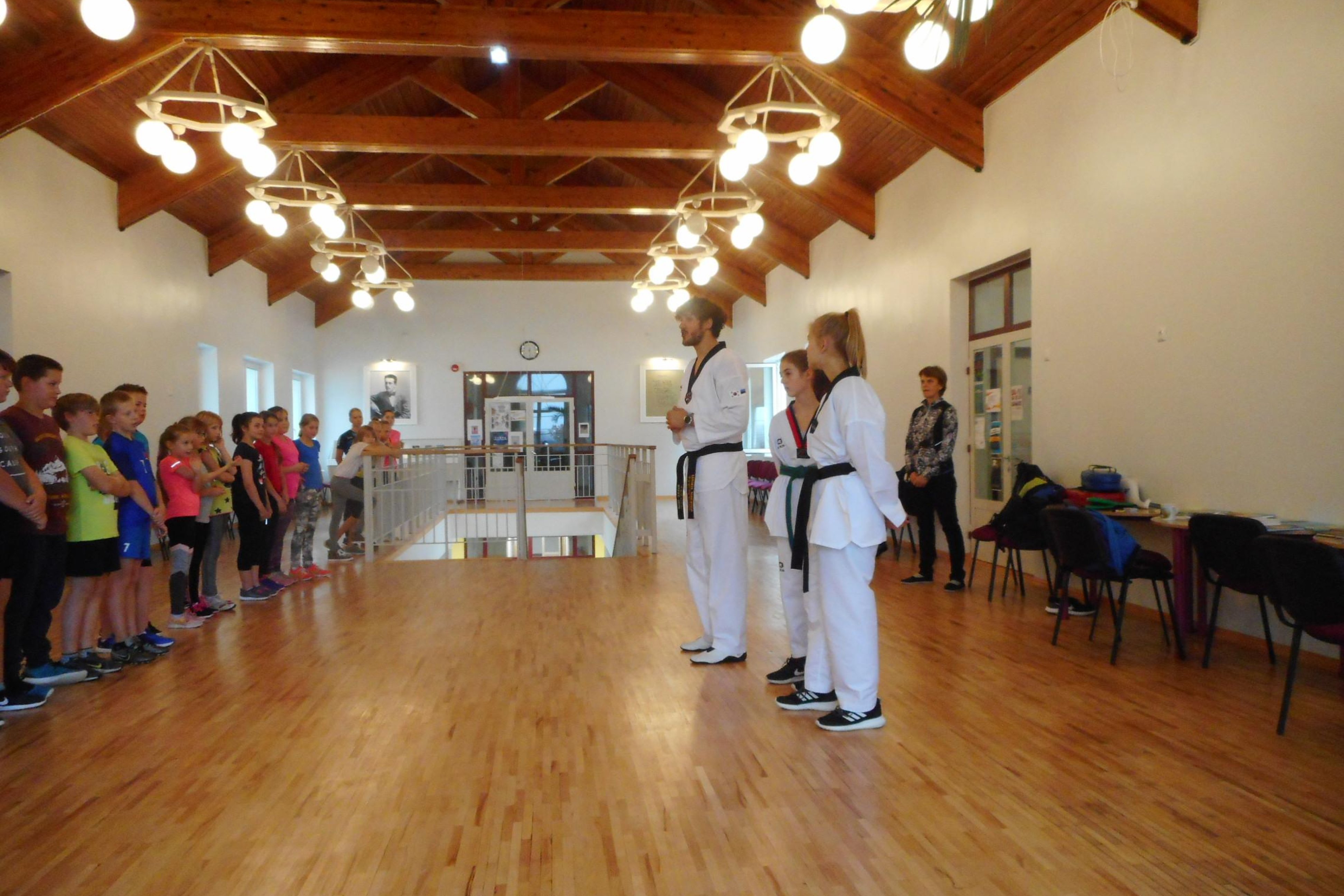 Täna (18.10.) teab kogu koolipere üht-teist taekwondost ja seda seetõttu, et terve päev olid majas taekwondoklubi Alfa+ treener Burak koos noorsportlaste Kaia Laatspera ja Marin Danieliga. Kõik kehalise kasvatuse tunnid möödusid enesekaitse esmatarkusi õppides. Treeningud käisid valjuhäälselt, kuid sporditavade häid reegleid järgides. Kuna treeneri eesti keele oskus oli tagasihoidlik, tuli kasuks inglise keele tundmine. Nii tabati kaks kärbest ühe hoobiga: õpiti keelt ja saadi esimesed teadmised enesekaitsest.